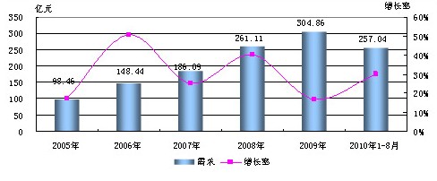 圖表 2005-2010年我國新型建筑加固材料行業(yè)需求及增長對(duì)比