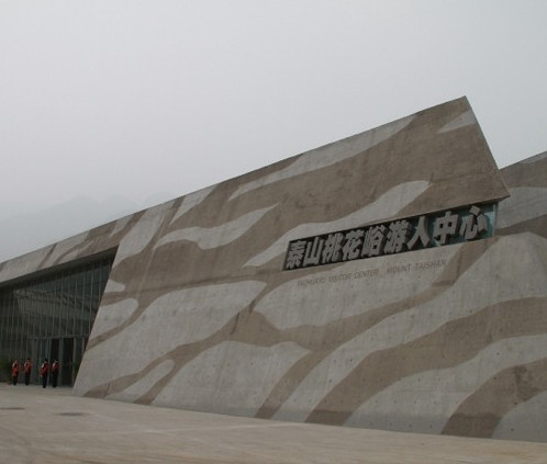 泰山桃花峪游人中心建筑是一組不規則的幾何體,像幾塊散落在桃花峪山口的巨型巖石,蔚為壯觀。它是由中國十大建筑設計大師之一崔愷先生主持規劃設計,集車輛停放、游人集散、信息展示、旅游咨詢等多功能于一體的綜合性旅游服務基礎設施,項目規劃總占地80.3畝。跳動的彩石紋理揮灑著最本質的美感,純粹的建筑語言詮釋出回歸本土的理念。這就是泰山桃花峪游人中心——國內首座大面積采用傾斜清水混凝土墻體的美麗建筑。它不僅是一座現代化游人服務中心,同時其獨特的建筑形式也成為一處新的旅游亮點,可增加游客在泰山的滯留時間,將游客由傳統的中軸線旅游向泰山西翼拓展,并帶動泰山西翼休閑度假旅游的發展,成為泰山腳下的點睛之筆。