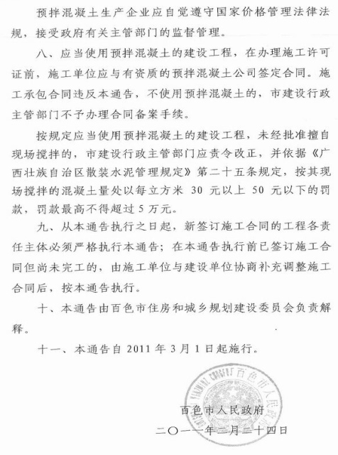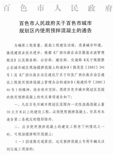 廣西:關(guān)于百色市城市規(guī)劃區(qū)內(nèi)使用預(yù)拌混凝土的通告