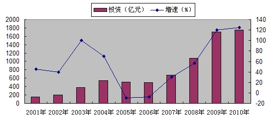 2001年以來(lái),水泥投資呈波動(dòng)型增長(zhǎng)(見圖9),2003年和2009年國(guó)務(wù)院分別以國(guó)辦發(fā)[2003]103號(hào)文、國(guó)發(fā)[2009]38號(hào)文先后兩次下發(fā)文件抑制水泥投資過(guò)熱,扭轉(zhuǎn)投資過(guò)熱造成的產(chǎn)能過(guò)剩。
