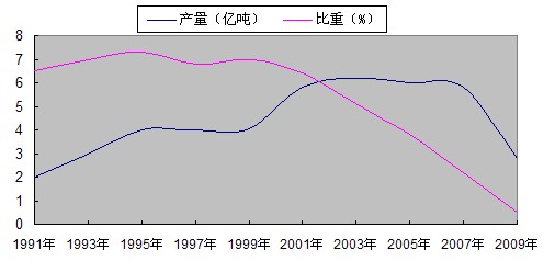 圖5 1991至2010年立窯水泥產(chǎn)量及所占比重