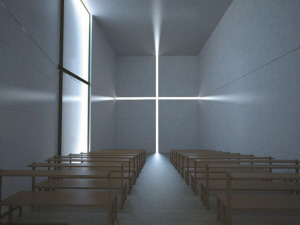 在日本大阪城郊靜謐處,有一座木結構教堂和牧師住宅擴建的獨立小教堂。在黑暗盡頭冰冷堅實的混凝土墻壁上,建筑師鑿出縱橫兩道巨大開口,光線從未知的外界穿透十字架的罅隙闖進來這是著名建筑“光之教堂”,日本著名建筑師安藤忠雄遐邇世界的成名作。