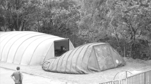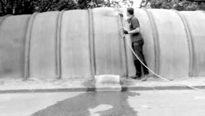 混凝土帆布帳篷裝在箱子里運送到部署現場。在這里,需要做的僅僅是解包,將卷形的帆布展開,接上空氣壓縮泵,朝充氣囊內灌注空氣,充氣囊像充氣玩具那樣膨脹成型,把帆布包撐成帳篷。之后,只需要用水對其帳篷外部徹底大沖刷,使用臟水也無妨,讓嵌入帆布的混凝土水合化。