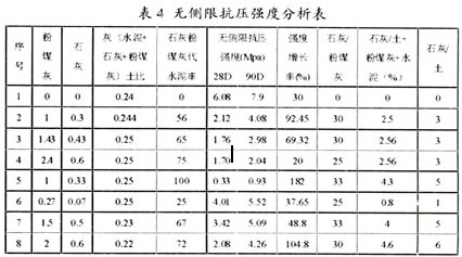 為了確定粉煤灰摻入后粉噴樁的樁身強度,從現場鉆取粉煤灰粉噴樁樁身不同深度芯樣進行無側限抗壓強度試驗,并且將之與實驗室內預配不同配比、不同齡期試塊的無側限抗壓強度值進行比較,如表4.所示。從表中可以看出,隨著粉煤灰摻入量的增加,樁身強度有一定幅度的降低,但樁身強度隨時間的增長率有大幅度的提高。由于粉噴樁的樁身強度在一定攪拌時間內與攪拌程度成正比,即將固化劑與軟土攪拌時,隨著攪拌時間增加,加固土的強度急劇增長,拌和到一定時間后,強度上升的趨勢減緩。由于施工機具的工作性能限制,粉體材料的摻入比不宜大于30%。因此,嚴格控制現場施工的質量是保證粉噴樁質量的關鍵。