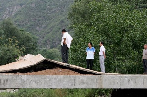 7月25日晚9時(shí)許,商洛市商州區(qū)黑龍口鎮(zhèn)大商塬村黑溝灣的一座橋,橋面突然爆裂。人們對(duì)爆炸原因感到頗為蹊蹺,因?yàn)榇蠹殷@訝地發(fā)現(xiàn)橋肚子里全是鋸末。發(fā)生爆裂的橋位于大商塬村六組。這座約25米長(zhǎng)、4米寬的水泥橋,北側(cè)一段5米長(zhǎng)的橋面爆裂,呈“人”字形,被頂起約1米高;北側(cè)橋體兩邊的水泥護(hù)欄全部被炸落到橋下。拱起的橋面露出了橋體內(nèi)部一堆黃色的物質(zhì),遠(yuǎn)看像沙,抓起來細(xì)看全是鋸末。