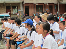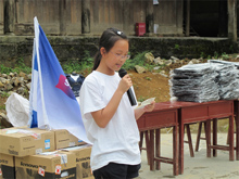 下飼小學(xué)學(xué)生現(xiàn)場領(lǐng)取書包和文具 夏令營成員代表發(fā)言