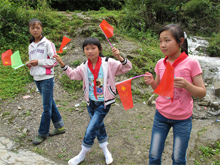 下飼小學(xué)學(xué)生手拿小紅旗歡迎遠道而來的客人 下飼小學(xué)學(xué)生現(xiàn)場表演小品