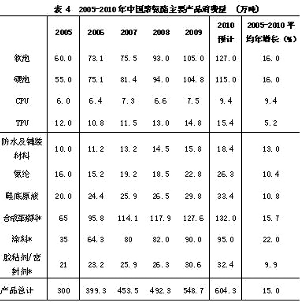 2005~2010年中國(guó)聚氨酯主要產(chǎn)品消費(fèi)量