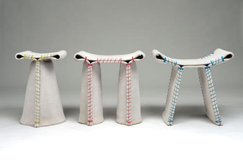 這一系列凳子是由帆布和混凝土制造而成的,設計師首先將混有混凝土的帆布材料浸水加以定型,再用彩色的線將布料邊緣縫合起來,最后直至其完全硬化。最終的作品不僅看起來時尚感十足,而且非常結實耐用。它不僅耐日曬,還具有防火、防水的特點,室內室外均可以使用。