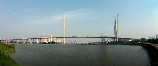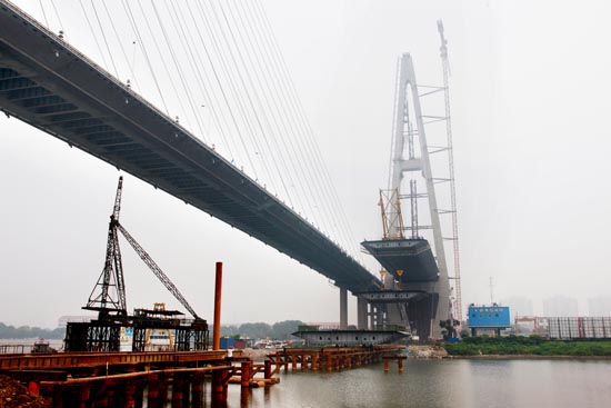 在世界已建成的排名前十位的大跨度斜拉橋中,我國(guó)已有8座大橋位列其中,這是筆者在由中國(guó)鐵建十五局集團(tuán)公司承建的天津?yàn)I海新區(qū)的標(biāo)志性工程——天津集疏港交通主通道海河特大橋建設(shè)工地中國(guó)鐵建斜拉橋技術(shù)觀摩會(huì)上獲得的消息。在世界目前排名前十位的大跨度斜拉橋中,除日本的多多羅大橋和法國(guó)的諾曼底大橋外,其余8座打垮度斜拉橋全部在中國(guó)。其中以主跨為1088米的蘇通大橋、主跨為1018米的昂船大橋、主跨為926米的鄂東長(zhǎng)江大橋分別位列前三位。