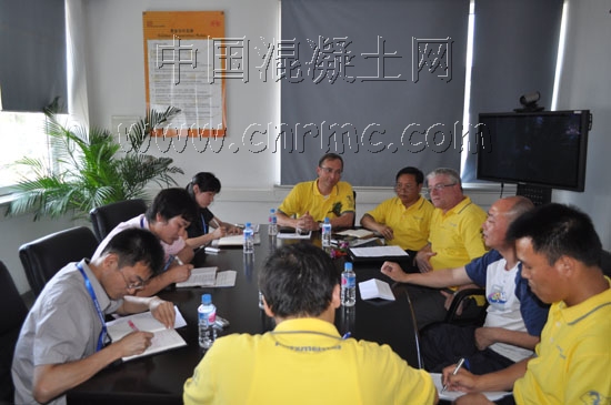 中國(guó)混凝土網(wǎng)記者現(xiàn)場(chǎng)采訪技術(shù)總監(jiān)蘇建良先生(左二)和研發(fā)部總監(jiān)騰萬(wàn)里先生(右一)