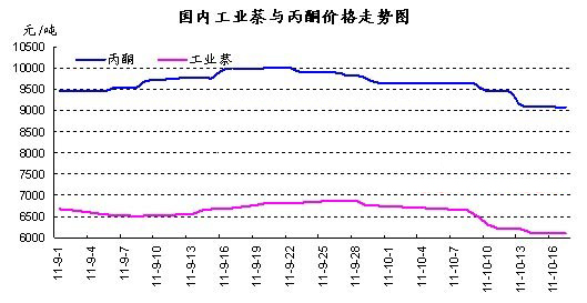 1、價格走勢:工業萘從9月17日左右開始在前期緩坡上漲后一周時間里短暫盤整,之后開始下滑,即從6400-6800元/噸的主流價格一路下跌至9月30日價格在6100-6500元/噸,跌幅在300元/噸。國慶節小長假過后,10月8日上班以后,工業萘價格低位徘徊,6000-6100元/噸的主流價格持續到17日,低端已到5800元/噸,高端僅為6350元/噸。