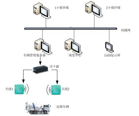 車輛管理系統(tǒng)配置在攪拌站進出口安裝有一臺RFID射頻識別讀卡器、2個RFID識別天線、一個檢測指示燈,每臺進出攪拌站的車輛上安裝有一個車載標簽;運輸車輛在進出攪拌站時無須下車,只需減慢速度行駛,行駛至RFID檢測區(qū)域范圍內,識別天線將自動檢測車載標簽中的存儲信息,傳送至讀卡器中,并將信息通過局域網反饋至車輛管理系統(tǒng);攪拌站中車輛管理調度中心的電腦與RFID射頻識別讀卡器相聯,獲取車載標簽信息,方便混凝土生產及各辦公室人員調用管理;在攪拌站停車區(qū)域上方安裝有一塊LED顯示屏,顯示攪拌站的生產調用車輛狀態(tài)及車輛的排隊信息。