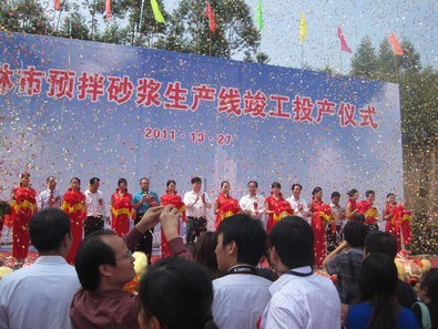 金秋送爽,陽(yáng)光明麗,2011年10月27日上午,玉林市人民政府舉辦了玉林市第一條預(yù)拌砂漿生產(chǎn)線竣工投產(chǎn)儀式,玉林市人民政府副秘書(shū)長(zhǎng)蔡明主持儀式,副市長(zhǎng)禤甲軍在儀式上致辭,市人大副主任李克民宣布玉林市第一條預(yù)拌砂漿生產(chǎn)線竣工投產(chǎn)。