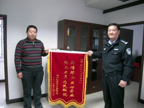 12月6日上午,淄博新博混凝土有限公司的負(fù)責(zé)人將一面印有“熱情服務(wù) 關(guān)心企業(yè) 敬業(yè)正直 為民解憂”的錦旗和一封感謝信送到了周村交警大隊教導(dǎo)員孫奇手中,以表達(dá)他們對周村交警大隊的感謝。