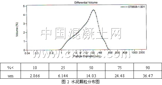 可見2.866μm以下的顆粒體積總量小于10%,24.48μm以下的顆粒占總量的75%,即水泥中65%的量集中在2.866μm~24.48μm區間,對性能起主要作用的14.03μm~24.48μm顆粒占25%,整個顆粒級配比較合理。
