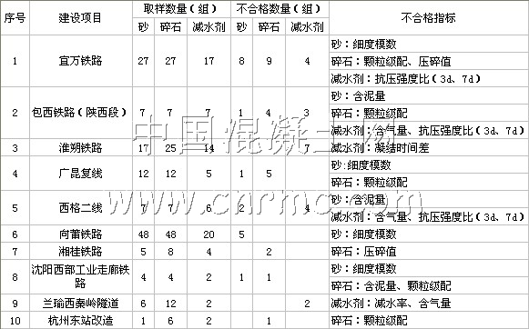 6月5日至25日,監(jiān)督站對(duì)有關(guān)鐵路項(xiàng)目原材料進(jìn)行行了抽檢,檢測項(xiàng)目為砂、碎石、減水劑,共取樣456組,其中砂167組、碎石192組、減水劑97組,其中結(jié)果顯示20組減水劑不合格,減水劑合格率為79.2%。具體結(jié)果如表: