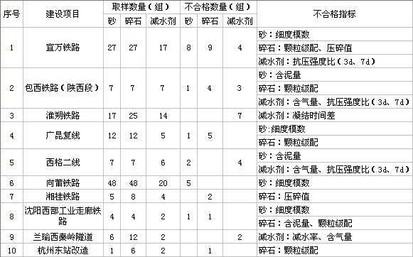 為加強普速鐵路混凝土原材料質量控制,工程監督總站6月份組織16個區域監督站(沈陽、北京、呼和、濟南、太原、西安、南昌、上海、武漢、廣州、成都、南寧、昆明、蘭州、青藏、島魯木齊)分別對16個在建普速鐵路項目(沈陽西部工業走廊、薊港、包滿、準朔、東都至平邑、宜萬、向莆、杭州東站改造、長沙南北站、湘桂、渝利、廣昆復線、包西、蘭渝西秦嶺隧道、西格二線、喀什至和田)的原材料進行一次抽樣檢測。現將有關情況通報如下: