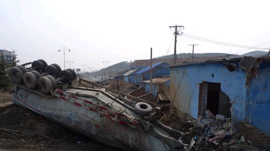 這輛大型水泥罐車為煙臺(tái)福山區(qū)某單位所有,車禍中罐車車體部分栽倒在水溝邊的土坎上,一端插進(jìn)臭水溝內(nèi)。與之緊鄰的是一處因撞擊墻體破開的配電室,和一個(gè)脫落于主體墻的半圓形磚墻。清障工作人員正忙著將電子信號(hào)燈的基座和設(shè)備從地上清理干凈。不久,已經(jīng)嚴(yán)重變形的罐車車頭被吊到馬路上,工作人員趕緊上前破拆駕駛室。讓人不忍目睹的是,駕駛室內(nèi)包括司機(jī)在內(nèi)的兩名男子早已沒了生命體征,在車禍?zhǔn)鹿手胁恍疑硗觥?