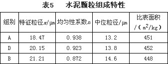 通過水泥顆粒累積分布曲線圖(圖4)和統(tǒng)計粉磨產(chǎn)品粒度分布最常用的羅拉本(RRB)公式: ,進一步分析以上三組水泥的顆粒組成特性。根據(jù)式中某一粒徑x(μm)的累積篩余量R(%),可以計算出顆粒分布的特征粒徑x和均勻性系數(shù)n。結(jié)合圖4和表4中數(shù)據(jù),取其中>8μm和>32μm這兩項最有代表性的累積篩余含量代入RRB公式,求出水泥A、D和B三組水泥的特征粒徑和均勻性系數(shù),分別列于表5。