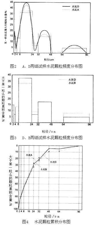 從圖2、圖3可以看出,D、B、A三組水泥在2~64μm之間的幾個局部粒徑范圍內(nèi)存在著較明顯而有規(guī)律的差別。其中,強度最高的D組水泥在8~24μm和32~48μm兩個粒級范圍內(nèi)的顆粒含量明顯多于A組水泥和B組水泥,而在2~64μm的其余范圍內(nèi)顆粒含量均低于或等于A、B兩組水泥。僅在>64μm和<2μm的范圍內(nèi),D組水泥的顆粒含量介于A組水泥和B組水泥之間。