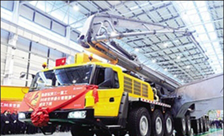 2011年的日本地震,讓世界再一次見(jiàn)證了“中國(guó)制造”的力量。三一62米臂架泵車開(kāi)往福島參與核電站機(jī)組注水作業(yè),緩解了核泄漏危機(jī)。2011年12月11日,世界吉尼斯紀(jì)錄英國(guó)總部認(rèn)證代表阿曼達(dá)莫禪,正式把全球最長(zhǎng)86米臂架混凝土泵車的世界紀(jì)錄證書(shū),交到了三一重工執(zhí)行總裁易小剛手中.從86米臂架的世界紀(jì)錄向前倒數(shù),三一重工一直在世界紀(jì)錄上反復(fù)自我刷新。四年前,三一66米泵車就曾為工程機(jī)械行業(yè)創(chuàng)下第一個(gè)吉尼斯紀(jì)錄,兩年前三一72米泵車也曾獲此認(rèn)證。
