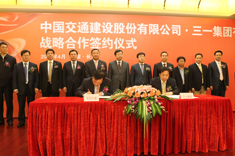 4月23日下午,“中國交通建設股份有限公司•三一集團有限公司戰略合作簽約儀式”在三一工業城隆重舉行。中國交建董事長、總經理、黨委副書記周紀昌,黨委副書記、監事會主席劉湘東,以及三一重工董事長梁穩根,總裁向文波,執行總裁易小剛等雙方領導共同出席活動。