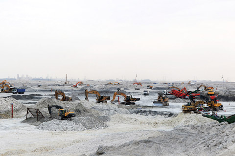 站在與澳門陸地面積相當的25平方公里的多哈新港項目施工工地上,耳邊回響的是機器的低沉轟鳴,目之所及,到處都是紅、黃相間印有SANY LOGO 的設備,一派繁忙的景象。