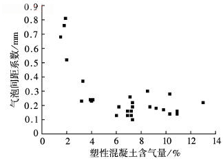 圖1 塑性混凝土含氣量與氣泡間距系數關系曲線