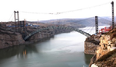 由中鐵六局集團太原鐵建公司承建的準朔鐵路黃河特大橋跨度356.8米,同類結(jié)構(gòu)中跨度屬世界第一,國際領(lǐng)先。大橋由引橋及鋼管拱主橋組成,全長655.53m。