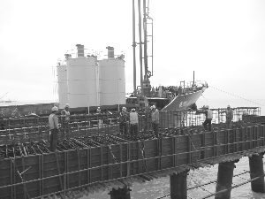 該下橫梁長19m,寬2.4m,高1.5m,共需澆筑混凝土77方。經(jīng)過前期的精心準備,克服了海上交叉作業(yè)的困難,終于順利完成第一根下橫梁的澆筑施工。該橫梁的順利完成,標志著該工程水上現(xiàn)澆施工全面鋪開,同時也為后續(xù)構(gòu)件安裝施工的全面展開打下了堅實的基礎(chǔ)。