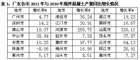 2011年我省各地預拌混凝土產量的增長幅度不一,粵東、粵北和粵西等地的產量增長較大,在全省的比重由2010年的19%提高到28%,較往年有較大提高,如汕尾市2011年預拌混凝土產量為111.3萬立方米,與上年同比增長了326.11%,河源市2011年預拌混凝土產量為305.41萬立方米,與上年同比增長了255.75%,肇慶市2011年的產量為241.6萬立方米,與上年同比增長了97.77%;云浮市2011年的產量為75.5萬立方米,與上年同比增長了64.13%;而廣州、珠海等市因受國際經濟持續動蕩,國家宏觀調控政策、房地產市場等因素的影響,增長較緩慢甚至負增長,分別為4.77%和-8.06%。我省各市2011年預拌混凝土企業的產量與2010年產量同比增長情況如表1:
