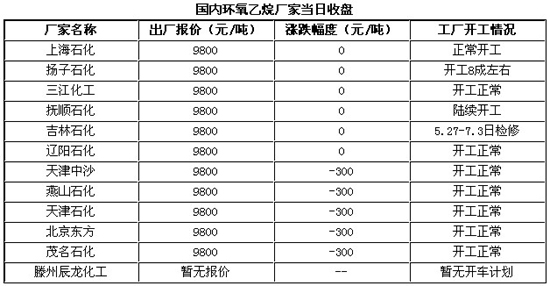 今日,中石化華南公司以及華北公司結算價格出臺,以9800元/噸收穩,屆時國內環氧乙烷統一價格均為9800元/噸;之前的謠言化為浮云,業內心態稍顯放松;當前部分工廠適當降低負荷,終端需求仍有待恢復,謹慎觀望中。