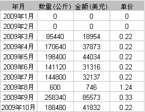 根據國家海關總署數據顯示,2009年10月份金冠建材(深圳)有限公司(以下簡稱金冠建材)累計出口聚羧酸減水劑188.48噸,總金額為4.18萬美元。其出口主要特點有: