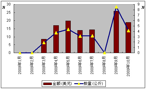 09年10份金冠建材出口聚羧酸減水劑匯總金額為4.18萬美元,本月較上月環(huán)比減少了51.12個百分點;08年10份金冠建材出口聚羧酸減水劑匯總金額為8.90萬美元,較去年同比減少了52.99%。