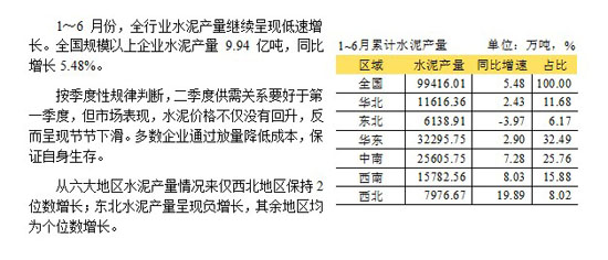 上半年水泥產(chǎn)量增速為5.48%,比去年增速下降近14個(gè)百分點(diǎn),二季度延續(xù)了一季度的量價(jià)齊跌局面。