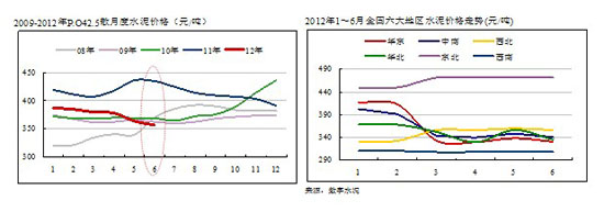2012年1季度后,又連續(xù)14周價(jià)格下跌。6月國內(nèi)水泥市場行情下行趨勢未變,價(jià)格跌落至近五年最低點(diǎn)。根據(jù)數(shù)字水泥監(jiān)測數(shù)據(jù)顯示,2012年6月全國水泥市場平均價(jià)格為356.61元/噸(P.O42.5散裝,下同),環(huán)比上月下跌2%,同比大幅下跌17.98%,較2010年平均價(jià)格低12元/噸。上半年小旺季價(jià)格持續(xù)下滑,一方面是受宏觀調(diào)控和新增產(chǎn)能影響供需嚴(yán)重失衡,另一方面企業(yè)協(xié)同破裂導(dǎo)致價(jià)格從阻擋式下跌轉(zhuǎn)變?yōu)槠俨际较碌珖鄶?shù)地區(qū)再次打響“價(jià)格戰(zhàn)”。