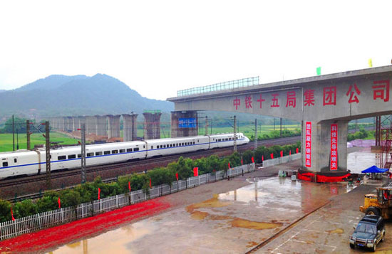 8月8日上午12時(shí)52分,位于江西省上饒市玉山縣六都鄉(xiāng)境內(nèi)的滬昆高鐵重點(diǎn)控制工程——湖沿特大橋建設(shè)工地,承擔(dān)施工任務(wù)的中鐵十五局集團(tuán)科學(xué)組織,精密測(cè)算,在努力將對(duì)既有滬昆鐵路繁忙運(yùn)輸?shù)挠绊憸p少到最低的情況下,經(jīng)過兩次要點(diǎn),56分中的空中轉(zhuǎn)體,國(guó)內(nèi)高鐵施工中跨度最大的單T構(gòu)轉(zhuǎn)體梁成功轉(zhuǎn)“身”58°,橫跨既有滬昆鐵路。12點(diǎn)20分,隨著又一列客貨列車從滬昆高鐵湖沿特大橋下穿過,標(biāo)志著滬昆高鐵湖沿特大橋單T構(gòu)轉(zhuǎn)體成功。