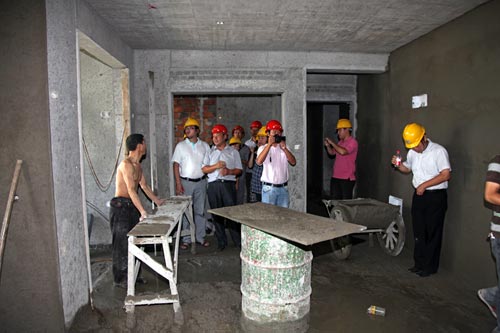 聽取施工單位師傅介紹預拌砂漿使用情況