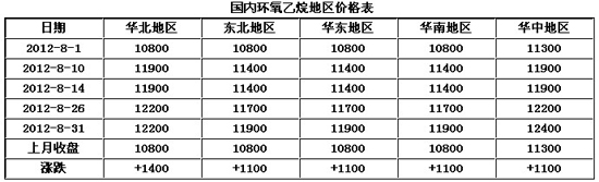 本月環氧乙烷維持上行態勢,國內工廠上調幅度不等,華北公司上調1400元/噸,執行12200元/噸,而其他區域公司則上調1100元/噸,執行11900元/噸不等;此次上調的主要因素在于供需失衡明顯,以華北地區為首由于天津石化兩套裝置檢修,當地供應缺口十分明顯,帶動拉漲氣氛;其他區域檢修也略顯集中,揚子石化檢修時間約45天左右,另外東北區域遼寧北化裝置于8.1日進入檢修期,初步計劃9.10日左右開車,所以東北以及華東地區供應面也隨之偏緊;且在價格上漲的同時,下游因采購不到環氧乙烷抵觸情緒升溫,開工受到一定的影響;臨近月底,隨著揚子石化陸續開車,環氧乙烷上調頻率稍顯放緩,華東區域供應緊俏局面也得到一定的緩解;聽聞,山東地區環氧乙烷裝置或將下月左右開車,屆時東北地區裝置也將陸續正常運行,供應格局也將發生實質性的變化。