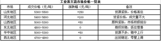 各地市場方面,山東地區主流現匯商談價格在5300-5500元/噸之間,零星高位商談價格在5600-5700元/噸;河北地區主流報盤在5400-6000元/噸之間,主流商談價格在5400-5600元/噸之間,部分高位商談在5700元/噸附近;華中地區商談價格維持在5000-5300元/噸之間,廠家惜售意愿較濃;山西地區市場商談多在5000-5300元/噸之間;東北地區主流商談價格在4800-5000元/噸之間;西北地區主流商談價格在4700-4900元/噸之間。
