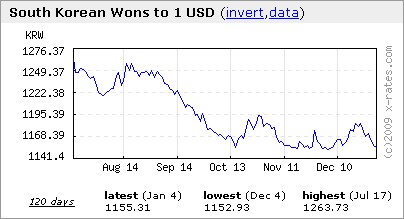 11月紐約商品交易所(NYMEX)的原油價格持續(xù)保持在75~80美元/桶之間振蕩,未能有明確的方向,在前期的大漲過后暫失上行動力,但亦表現(xiàn)較為抗跌,10月份時原油的大幅上漲使得油價重心大幅抬升,今年NYMEX原油價格最高點一度上探至82美元/桶。11月份原油也幾度試圖突破關(guān)鍵阻力位80美元/桶,但均無功而返,而在下探至接近75美元/桶一線時,亦表現(xiàn)出較強的支撐。11月份原油價格在振蕩區(qū)間之內(nèi)經(jīng)常性地出現(xiàn)暴漲暴跌;(如圖2)韓元兌美元匯率大幅下跌(如圖1)。預計聚醚進口價格將有小幅的上調(diào)空間。