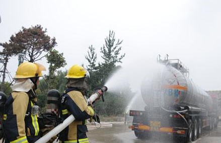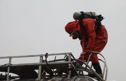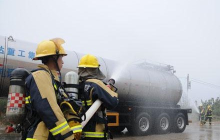 9月26日11時29分,泰安市公安消防支隊作戰指揮中心接到報警,稱在泰安省莊文化路泰新高速口橋下,一輛載有29噸環氧乙烷的槽罐車,在通過文化路與高速路橋時與限高桿發生碰撞,車輛罐頂法蘭處遭到破壞,導致環氧乙烷泄漏。接警后,支隊迅速調集東關中隊、特勤一中隊50名官兵12輛消防車趕赴現場。