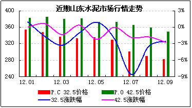 相對(duì)整個(gè)華東市場(chǎng)而言,山東市場(chǎng)本月的走勢(shì)絕對(duì)是最差的,因?yàn)樗侨A東地區(qū)唯一一個(gè)水泥價(jià)格出現(xiàn)下跌的區(qū)域市場(chǎng),且跌幅還不算小。其中P.O42.5標(biāo)號(hào)水泥本月均價(jià)為349.4元/噸,相比上月的359.4元/噸,跌幅為2.8%;同期P.C32.5標(biāo)號(hào)水泥均價(jià)跌幅也達(dá)到2.6%,當(dāng)前均價(jià)為382.8元/噸。
