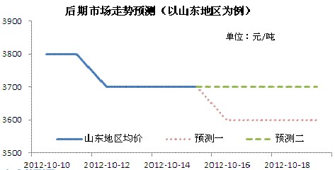 目前來看,萘系減水劑市場上下受挫,加之后期隨著氣溫的逐漸下滑,萘系高效低濃減水劑所占的市場份額將逐漸下滑,因此認為,短線市場或延續弱勢行情。料短線市場市場走勢或二選一,如下圖所示: