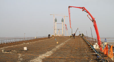 中朝鴨綠江界河公路大橋引橋采用箱梁現(xiàn)澆施工,13—14號墩為60米現(xiàn)澆箱梁。為了確保首片箱梁澆筑成功,項目部專門編制了《中朝鴨綠江界河公路大橋60米箱梁施工方案》,為了攻克箱梁高性能混凝土配合比和外觀技術(shù)難關,項目部專門成立了技術(shù)攻關小組,在反復試驗中總結(jié)出了混凝土最佳配合比和最好施工工藝,攻克了施工技術(shù)難關,使橋梁質(zhì)量達到了內(nèi)實外光的效果。為了確保施工安全,在支架安裝完成后,專門進行了預壓試驗。為了確保第一孔箱梁順利澆筑施工,在箱梁鋼筋綁扎完畢、立好模板后,項目部澆筑了試驗粱段,指揮部專門組織有關人員對其進行了首件檢驗。澆筑前,項目部又專門對全體參加施工人員召開了安全和技術(shù)交底會。此次澆筑成功的橋梁為單室單箱60米斜腹板截面,采用C50高性能混凝土,雙向預應力混凝土連續(xù)箱梁,滿鋪支架澆筑施工。箱梁頂寬13.85米,箱室底寬5.824米,外側(cè)翼緣板長3.25米,梁高3.5米。該箱梁設計新穎、技術(shù)先進,棱角分明,線條流暢,達到國內(nèi)同類橋梁建設先進水平。