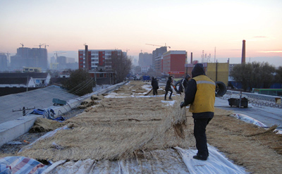 近日,東北氣溫驟然轉冷,夜間溫度下降到零下8度,在二公司哈齊客專的工地上,施工生產正在如火如荼的開展,為了使混凝土在低溫下保證質量,二公司哈齊客專為混凝土穿上了“冬衣”,在新澆筑的混凝土路面上覆蓋土工布、草墊子 、塑料布、氈被,層層覆蓋包裹,確保混凝土澆筑合乎質量要求。