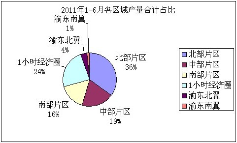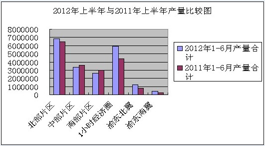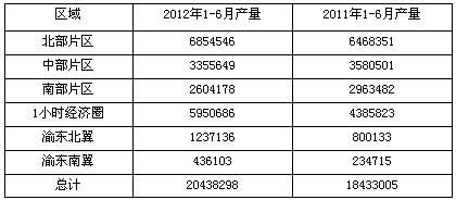 從上表看,2012年上半年中部片區(qū)和南部片區(qū)的產(chǎn)量較同期有所下滑,其余片區(qū)總量均有所增加。北部片區(qū)增長5.97%;1小時經(jīng)濟(jì)圈增長了35.68%;渝東北翼增長了54.61%;渝東南翼增長了85.8%,中部片區(qū)下降了6.27%;南部片區(qū)下降了12.12%。