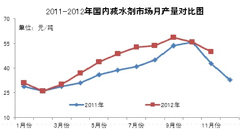 目前2012年已經(jīng)接近尾聲,據(jù)卓創(chuàng)資訊不完全統(tǒng)計,預計今年國內(nèi)減水劑市場總產(chǎn)量約在532萬噸,較去年的462萬噸,仍有70萬噸的增幅。雖2012年我國樓市調(diào)控政策依舊從嚴,但各類保障房以及道路基建工程量尚可,因此減水劑市場產(chǎn)量仍呈現(xiàn)緩慢上升的態(tài)勢。另外,據(jù)卓創(chuàng)不完全統(tǒng)計,此部分增量主要來自聚羧酸減水劑市場以及脂肪族減水劑市場,其中聚羧酸減水劑市場增量相對明顯。下圖為2011-2012年我國減水劑市場月產(chǎn)量統(tǒng)計: