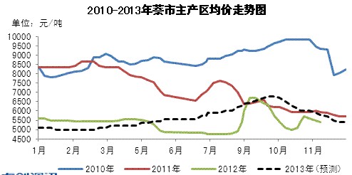 圖6 2011-2013年(預(yù)測)萘市主產(chǎn)區(qū)均價走勢對比
